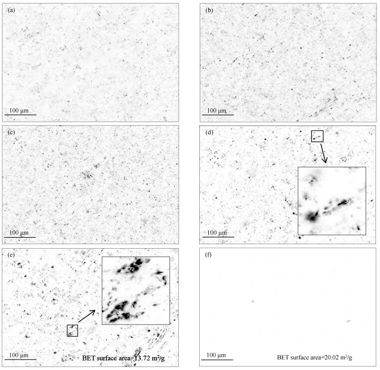 (a): 550 ℃; (b): 650 ℃; (c): 750 ℃; (d): 850 ℃; (e): 950 ℃; (f): 950 ℃ A-biomass char