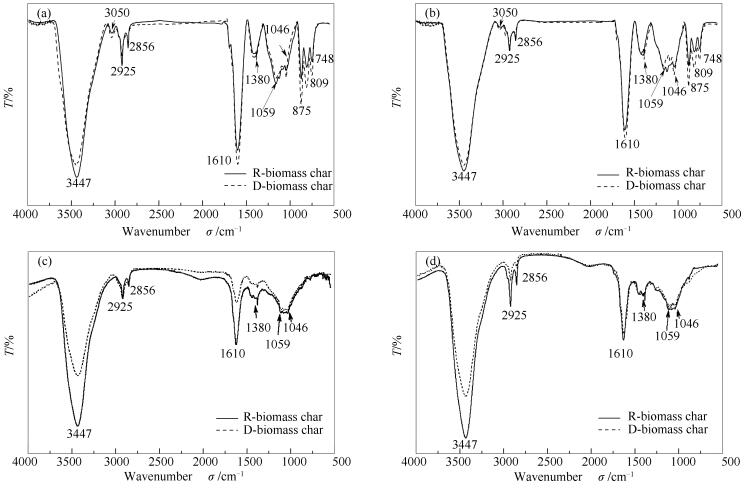 (a): 550 ℃ R-biomass char; (b): 550 ℃ D-biomass char; (c): 950 ℃ R-biomass char; (d): 950 ℃ D-biomass char