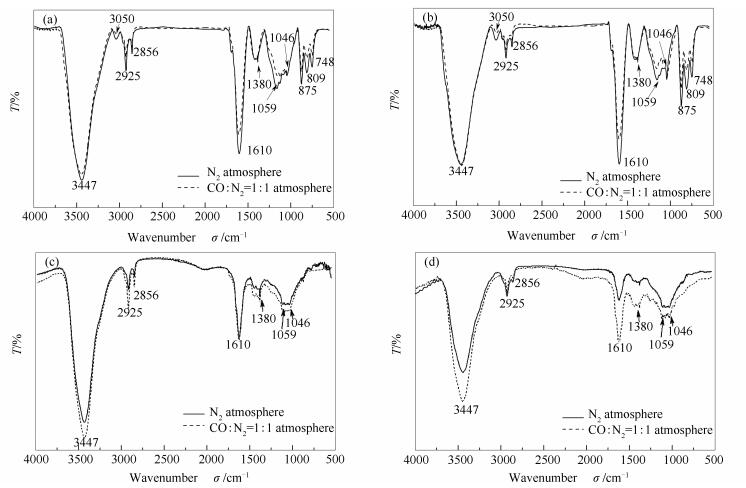 (a): 550 ℃ N2 atmosphere; (b): 550 ℃ CO:N2=1:1 atmosphere; (c): 950 ℃ N2 atmosphere; (d): 950 ℃ CO:N2=1:1 atmosphere