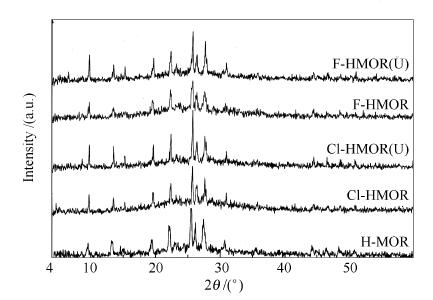 (a): H-MOR; (b): Cl-HMOR; (c): Cl-HMOR (U); (d): F-HMOR; (e): F-HMOR (U)