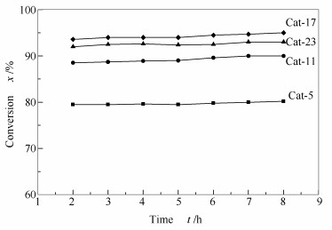 A series of Ni2P/Ce-Al2O3 catalysts were prepared by temperature-programmed reduction method, and the influence of Ni2P loading on the catalyst structure and naphthalene hydrogenation saturation performance was investigated. The results show that the specific surface area, the Ni2P particle size and the active site number of the as-synthesized catalysts are greatly affected by Ni2P loading, which is derived from the variable interaction between active component Ni2P and the support Ce-Al2O3. When the Ni2P loading is 17% (mass ratio), the catalyst possesses a large specific surface area (40 m2/g), a small Ni2P particle size (26.3 nm), and the maximum number of active sites (26.7 μmol/g). Meanwhile, the conversion rate of naphthalene and the selectivity of decalin reach to 95% and 76%, respectively, and the activity stability of the catalyst is good, which is mainly attributed to the large specific surface area and high number of active sites of the catalyst providing more sites for the reaction.