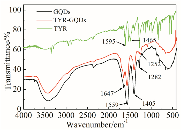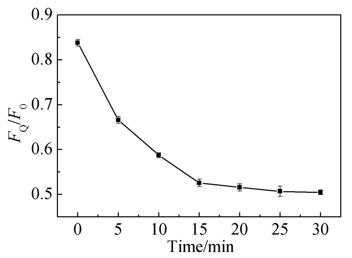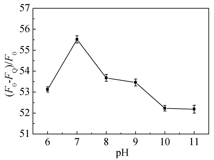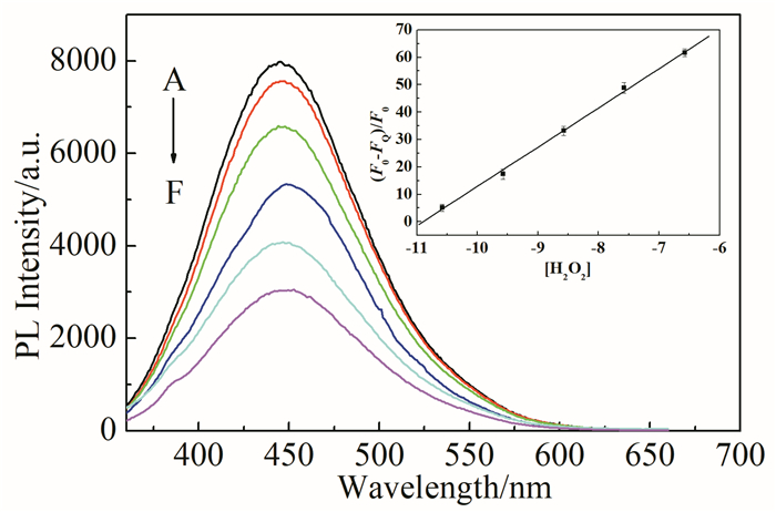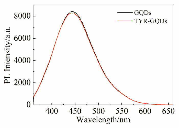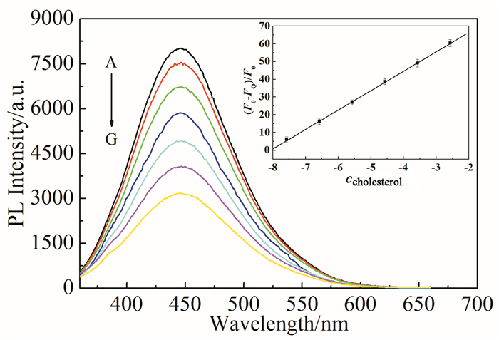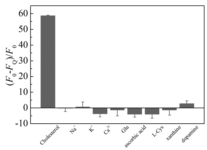 • In this study, graphene quantum dots (GQDs) with catalase activity were synthesized from citric acid. GQDs modified by tyramine (TYR-GQDs) can reduce hydrogen peroxide to hydroxyl radicals. GQDs aggregates through the cross-linking between phenolic hydroxyls, which leads to fluorescence quenching. Since cholesterol oxidase can catalyze the oxidation of cholesterol to produce H2O2, a fluorescence sensor for detecting cholesterol was established based on TYR-GQDs. The experimental results showed that under the condition of pH=7.4, the fluorescence quenching rate of TYR-GQDs exlibits a good linear relationship with the logarithm of cholesterol concentration (2.67×10-8~2.67×10-3 mol/L), and the detection limit is 9.32×10-9 mol/L. The interference experiment showed that the fluorescent sensor has high selectivity for cholesterol and can be used for the detection of free cholesterol in human serum. The recovery of standard addition is 96.55%~100.14%.