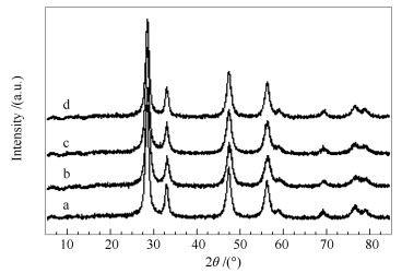 a: CeO2; b: CeO2-MNOx(NS); c: CeO2-MNOx(OB); d: CeO2-MNOx(SP)