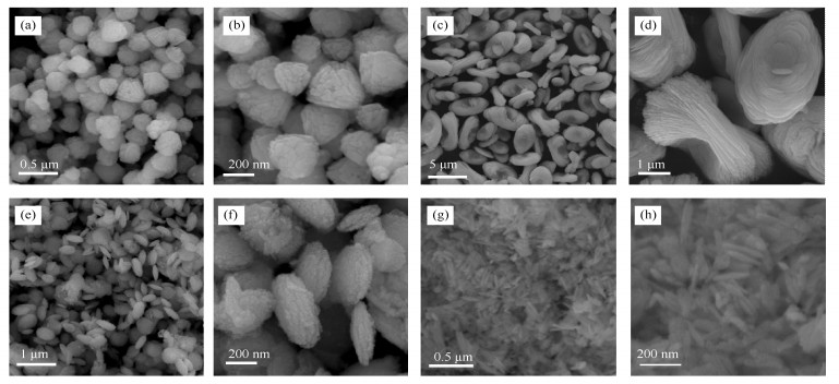 (a), (b): CeO2; (c), (d): CeO2-MNOx(SP); (e), (f): CeO2-MNOx(OB); (g), (h): CeO2-MNOx(NS)