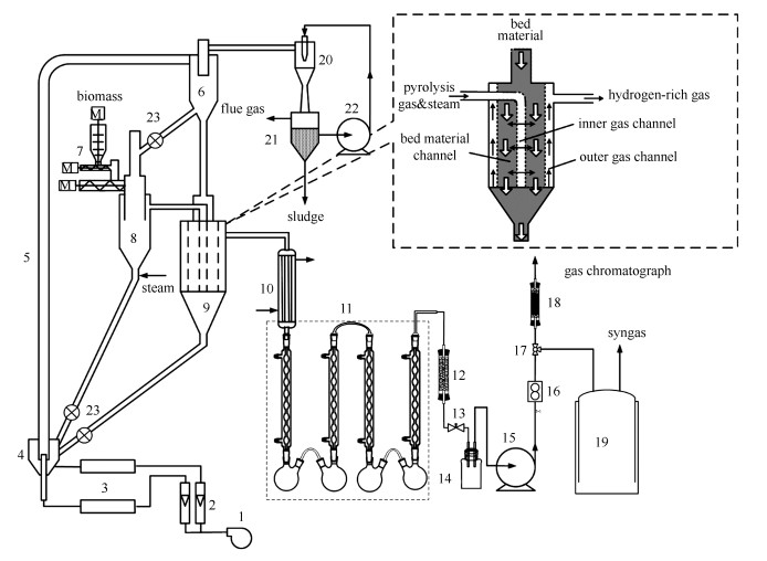 1: air compressor; 2: gas flow meter; 3: air pre-heater; 4: pre-fluidizer; 5: riser combustor; 6: cyclone; 7: screw conveyor; 8: gasifier; 9: reformer; 10: pipe bundle condenser; 11: condenser; 12: cotton wool filter; 13: needle valve; 14: surge flask; 15: vacuum pump; 16: gas meter; 17: three way valve; 18: silica gel filter; 19: gas holder; 20: venturi gas scrubber; 21: water tank; 22: circulating water pump; 23: rotary valve