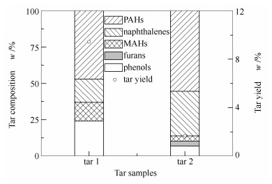 (tar 1: tar from the gasifie; tar 2: tar from the reformer)