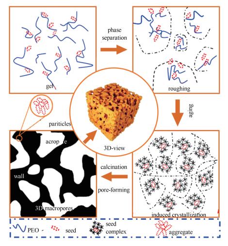 • Hierarchically porous alumina with three-dimensional interconnected pore structure was prepared by phase separation method with alumina sol as the seed crystals; the alumina material was then characterized by SEM, XRD, N2 sorption, mercury porosimetry and NMR. The results reveal that the ierarchically porous alumina is provided with macropores of 200-600 nm in gamma phase; it has a high surface area of 366 m2/g and narrow double pore size distributions at about 5 and 400 nm. As revealed by NMR, AlO4, and AlO6 are formed in the calcined alumina sample. It is then suggested that during the synthesis, PEO acted as a seed can inspire phase separation, generating the interconnected three-dimensional macropores, while the crystalline grain in the sol may induce the aluminum hydrates to form active AlOOH, which is then transformed to gamma crystalline phase by calcination even at mild temperature.