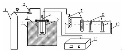 1: nitrogen cylinder; 2: mass flowmeter; 3: thermocouple; 4: heating furnace; 5: salt bath; 6: carbonization reactor; 7: cold trap; 8: gas washing bottle; 9: acetone; 10: ice-water bath; 11: controller