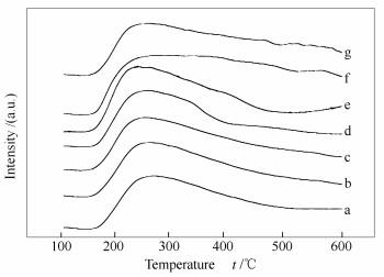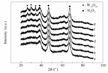 a: NiWF (0.00)/γ-Al2O3; b: NiWF (0.05)/γ-Al2O3; c: NiWF (0.10)/γ-Al2O3; d: NiWF (0.20)/γ-Al2O3; e: NiWF (0.50)/γ-Al2O3; f: NiWF (0.75)/γ-Al2O3; g: NiWF (1.00)/γ-Al2O3