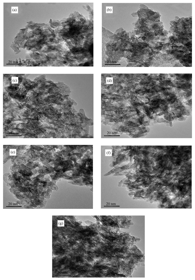 (a): NiWF (0.00)/γ-Al2O3; (b): NiWF (0.05)/γ-Al2O3; (c): NiWF (0.10)/γ-Al2O3; (d): NiWF (0.20)/γ-Al2O3; (e): NiWF (0.50)/γ-Al2O3; (f): NiWF (0.75)/γ-Al2O3; (g): NiWF (1.00)/γ-Al2O3