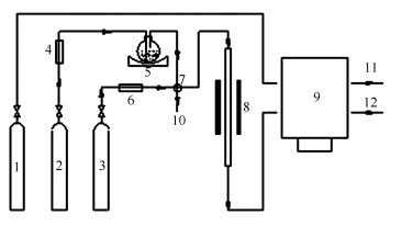 1: H2; 2: N2; 3: O2; 4, 6: flowmeter; 5: HCHO; 7: three way valve; 8: reactor; 9: chromatography; 10: exhaust; 11: carrier gas; 12: offgas