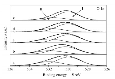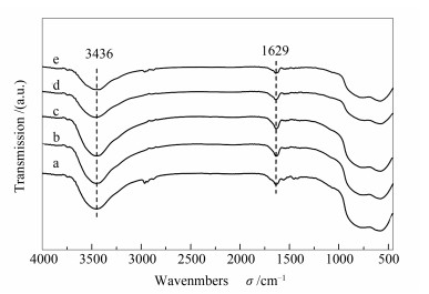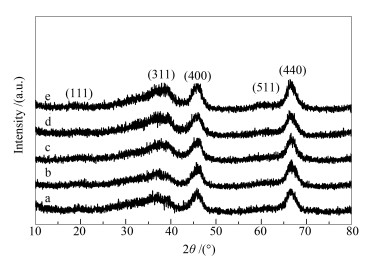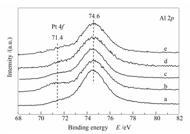 a: γ-Al2O3; b: Pt/γ-Al2O3-200; c: Pt-FeOx/γ-Al2O3-200; d: Pt-FeOx/γ-Al2O3-300; e: Pt-FeOx/γ-Al2O3-400