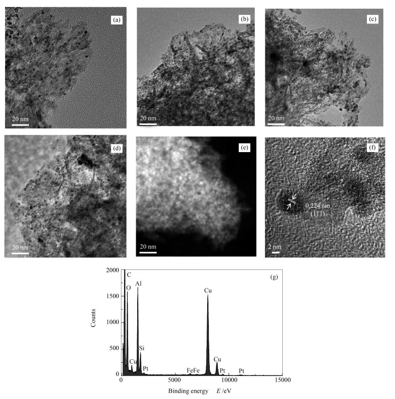 (a): Pt/γ-Al2O3-200; (b): Pt-FeOx/γ-Al2O3-200; (c): Pt-FeOx/γ-Al2O3-300; (d): Pt-FeOx/γ-Al2O3-400 (e): Pt-FeOx/γ-Al2O3-200; (f): Pt-FeOx/γ-Al2O3-200; (g): Pt-FeOx/γ-Al2O3-200