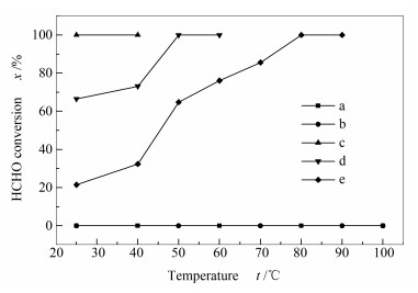 a: γ-Al2O3; b: Pt/γ-Al2O3-200; c: Pt-FeOx/γ-Al2O3-200; d: Pt-FeOx/γ-Al2O3-300; e: Pt-FeOx/γ-Al2O3-400 (reaction conditions: HCHO 375 mg/m3, φO2=20%, N2 balance, RH = 30%, GHSV: 60000 cm3/(g·h))