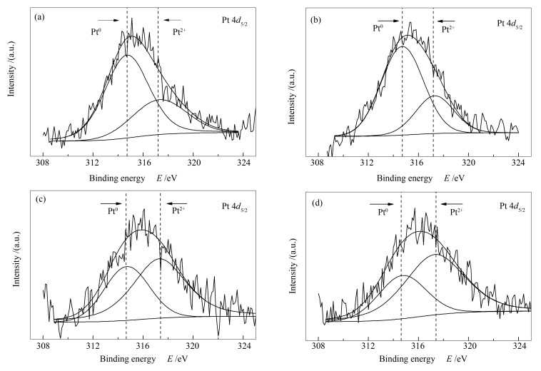 (a): Pt/γ-Al2O3-200; (b): Pt-FeOx/γ-Al2O3-200; (c): Pt-FeOx/γ-Al2O3-300; (d): Pt-FeOx/γ-Al2O3-400