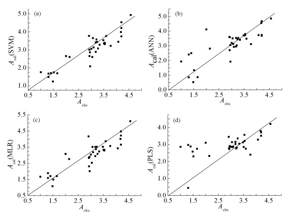 With the wide application of organophosphorus compounds (OPs), they have been detected in an increasing number of environmental media. Most OPs are poisonous, but people often lack fast and effective prediction methods to evaluate the toxicity. In this paper, the toxicity of 36 OPs was predicted by using different QSAR models combined with molecular descriptors by computer with E-Dragon software. Using the backward method as the screening result, root mean square error (RMSE) as evaluation standard, we found that the 14 molecular descriptors have a great influence on the linear kernel function of support vector machine (SVM) model. In the cross-validation results of SVM models, the correlation coefficient between the calculated value and the actual value was 0.913, the root mean square error is 0.388. In the results of external test verification, the average relative error was 9.10%. In addition, we also used multiple linear regression (MLR), artificial neural network (ANN) and partial least squares regression (PLS) models to predict the toxicity of OPs. The cross-validation results showed that the correlation coefficients between the calculated values and the actual values of the three models are 0.878, 0.686 and 0.620, respectively. Therefore, the linear kernel SVM model is an effective method for the toxicity prediction of OPs.