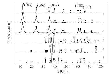 a: Cu/Al/Zn LDH; b: Cu/Al/Ni LDH; c: Cu/Al/Ni/Zn LDH; d: Cu/Al/Zn oxygen carrier; e: Cu/Al/Ni oxygen carrier; f: Cu/Al/Ni/Zn oxygen carrier ◆: Cu/Al/Zn LDH; ▲: Cu/Al/Ni LDH; ●: Cu/Al/Ni/Zn LDH; ○: CuO; ■: Al2O3; △: NiO; ◇: ZnO