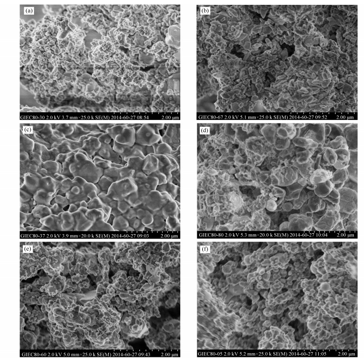 (a): Cu/Al/Zn fresh; (b): Cu/Al/Zn used; (c): Cu/Al/Ni fresh; (d): Cu/Al/Ni used; (e): Cu/Al/Ni/Zn fresh; (f): Cu/Al/Ni/Zn used