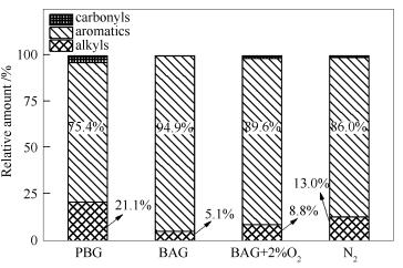 • Isothermal pyrolytic characteristics of PBG at 400℃ under different reaction atmospheres in a horizontal tubular quartz reactor were investigated and compared. Meanwhile, chemical structures of PBG and its pyrolysis solid products were also analyzed with the help of XPS and 13C NMR methods. The results indicate that tar yields derived from PBG pyrolysis are 50.71 and 37.45 mg/g under biomass air gasification (BAG) and N2 atmospheres, respectively, while 11.96 mg/g under BAG+2%O2 atmosphere, which indicates that the presence of oxygen can inhibit the production of tar. Furthermore, the dominant reaction is characterized as the polycondensed aromatization involving dehydrogenation and deoxygenation in PBG under BAG atmosphere, tending to the formation of heavy organic compounds such as tar. While, surface oxygen-containing organic functional groups can be generated via the oxidation reaction between some surface functional groups of PBG and O2 in PBG under BAG+2%O2 atmosphere, inhibiting the aromatization of aromatic clusters and the formation of heavy organic compounds such as tar to some extent. Thus, the introduction of a limited amount of oxygen may be helpful for solving the pipe blockage during hot gas filtration of the raw BAG gas.