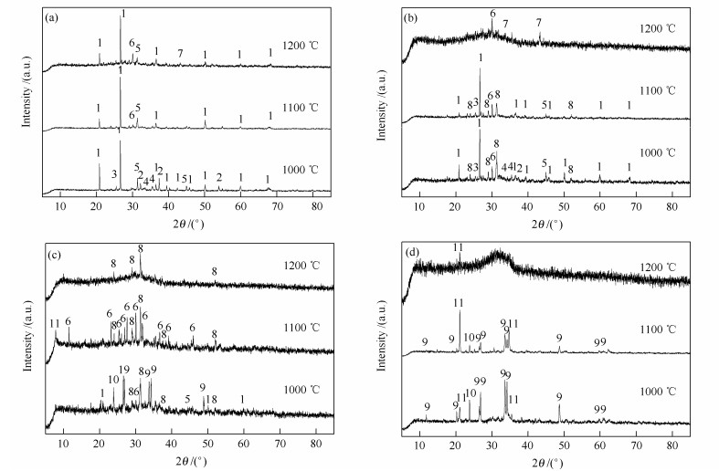 1: quartz; 2: mullite; 3: anorthite; 4: illite; 5: albite; 6: corundum; 7: nepheline; 8: cordierite; 9: carnegieite