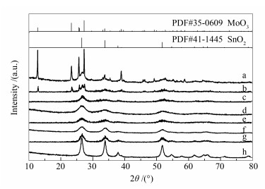 a: MoO3; b: Mo3Sn1; c: Mo2Sn1; d: Mo1Sn1; e: Mo1Sn2; f: Mo1Sn3; g: Mo1Sn4; h: Mo1Sn5; i: Mo1Sn10; j: SnO2