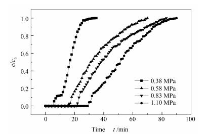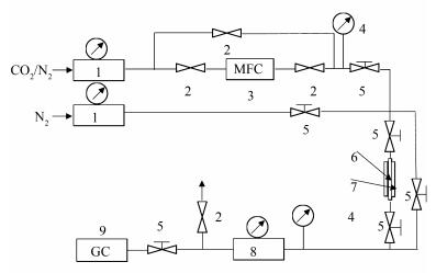 1: reduction valve; 2: ball valve; 3: mass flow controller; 4: pressure gauge; 5: stop valve; 6: adsorption column; 7: temperature controller; 8: back pressure valve; 9: gas chromatograph