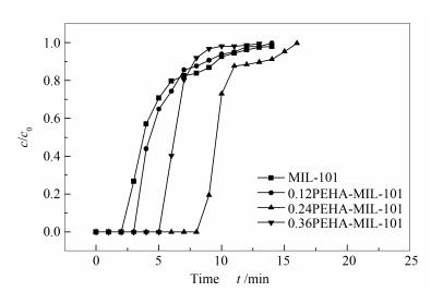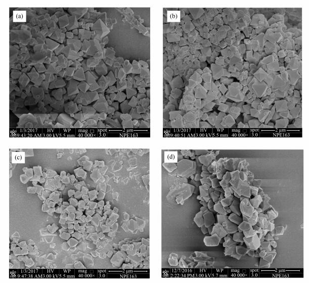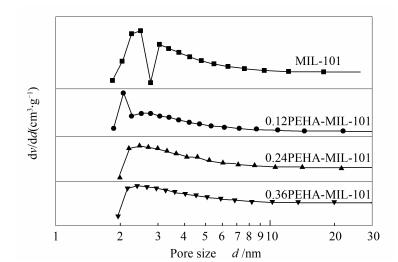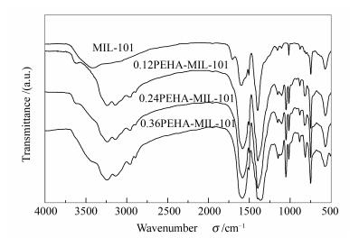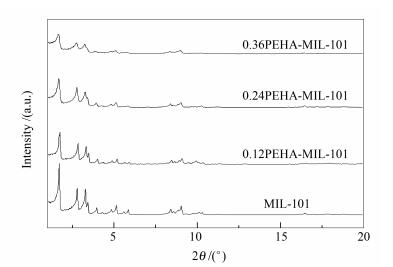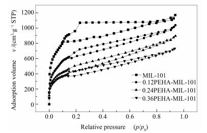 (a): MIL-101(Cr); (b): 0.12PEHA-MIL-101(Cr); (c): 0.24PEHA-MIL-101(Cr); (d): 0.36PEHA-MIL-101(Cr)