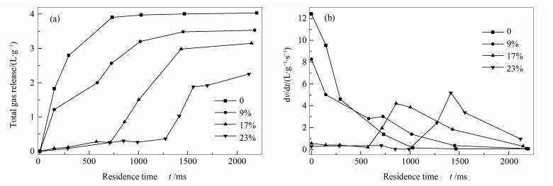 (a): variation of pyrolysis gas volume; (b): release velocity of pyrolysis gas volume