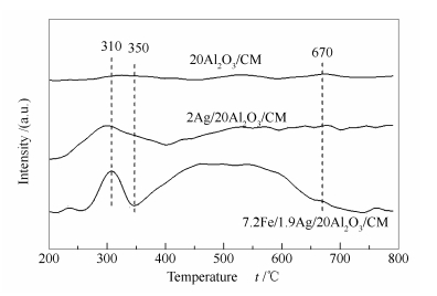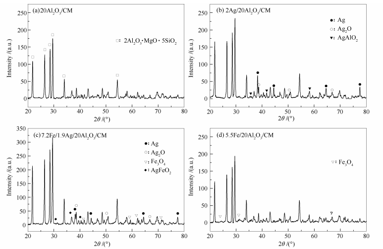 (a): 20Al2O3/CM; (b):7.2Fe/1.9Ag/20Al2O3/CM; (c): 2Ag/20Al2O3/CM; (d): 5.5Fe/20Al2O3/CM; (e): 8Fe/20Al2O3/CM