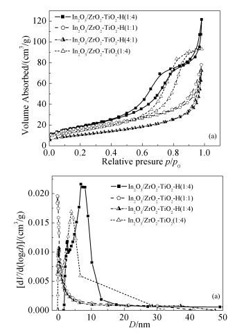 • In this paper, using polystyrene (PS) spheres as the template, In2O3/ZrO2-TiO2 hollow spheres (In2O3/ZrO2-TiO2-H) with different proportions were prepared by one-step method combined with calcination treatment.The structures, compositions and morphologies of as-prepared composites were characterized by XRD, XPS, UV-Vis/DRS, SEM and N2 absorption-desorption measurements.The results showed that In2O3/ZrO2-TiO2 composites had a hollow spherical structure after being treated by PS template, and the spherical wall was formed by the nanoparticles.After compounding In2O3 with ZrO2-TiO2, its optical absorption had red-shifted slightly, moreover, the specific surface area of In2O3/ZrO2-TiO2-H (1:4) hollow sphere was larger (66.92 m2·g-1).In2O3/ZrO2-TiO2-H (1:4) showed higher photocatalytic activity in the degradation of methyl orange (MO) under multimodes photocatalysis, compared with P25, ZrO2, In2O3/ZrO2-TiO2, and other ratio In2O3/ZrO2-TiO2-H.