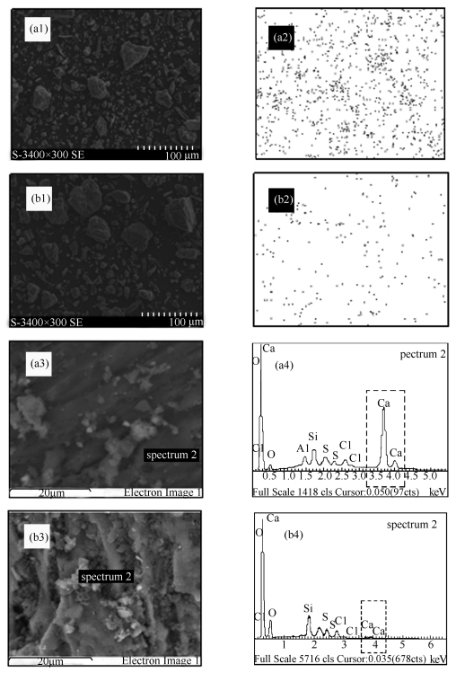 (a1)-(a4): Ca-J; (b1)-(b4): Ca-J+; (a1), (a3), (b1), (b3): SEM; (a2), (b2): Ca; (a4), (b4): EDS
