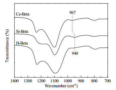 The FT-IR spectra of H-Beta, Si-Beta and Ce-Beta samples are given in Fig. 2. No obvious IR bands are present in 900-1000 cm−1 for the parent H-Beta sample while a band at ~948 cm−1 is present for the Si-Beta sample. This newly-formed band can be assigned to the presence of a large amount of defect sites as a result of the extraction of Al atoms from the Beta framework [19]. After the incorporation of Ce the 948 cm−1 band was absent indicating an interaction between Ce(IV) isopropoxide and the defect sites. Furthermore, a new band centered at 967 cm−1 is present in the Ce-Beta sample and this is indicative of the successful incorporation of Ce into the framework of the Beta zeolite.