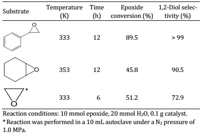 The ring-opening hydration of epoxides was selected as a model reaction to evaluate the catalytic performance of the post-synthesized Ce-Beta zeolite. Target 1,2-diols are widely used as important intermediates for the production of polyester resins, antifreeze, cosmetics, and other products. Typically, epoxide hydration is performed in a 25 mL round-bottom glass vessel with a cryogenic-liquid condenser under atmospheric pressure. In our test the vessel was charged with a mixture of 10 mmol epoxide, 20 mmol H2O and 0.1 g catalyst, which was mixed vigorously by a magnetic stirrer. Samples from the reaction were qualitatively analyzed using a Shimadzu 2010 GC (Japan, Agilent HP-5MS column, 30 m × 0.25 mm × 0.25 μm; FID detector) with octanol as the internal standard. The GC peaks were identified by comparison with the retention time of known standard samples and also by a Shimadzu GC-MS QP2010 SE equipped with an Agilent HP-5MS column. As shown in Table 2, considerable epoxide conversion as well as high selectivity toward 1,2-diols was obtained (ethers from the dimerization/trimerization were the main by-products) accompanied by the stoichiometric incorporation of water in the ring-opening reaction. However, under identical reaction conditions very little product (1%) was obtained for the cyclohexene oxide hydration reaction in the absence of the catalyst. The use of Si-Beta zeolite as the catalyst also resulted in low catalytic activity (< 3%). The influence of preparation method, i.e. DI (dry impregnation), WI (wet impregnation) or SSIE (solid-state ion-exchange) on the activity of Ce-Beta zeolite during the ring-opening hydration of epoxides was also investigated. Outstanding catalytic performance for Ce-Beta zeolite was only obtained when using the DI route. This shows the superiority of the two-step post-synthesis strategy that was developed for the preparation of Ce-Beta in this study. The hydration of epoxides is generally carried out with a large excess of water (nH2O/nepoxide = 20-25) at elevated temperatures (> 413 K) and/or in the presence of solvents to obtain high substrate conversion as well as the desired product selectivity. The catalytic results obtained with a lower nH2O/nepoxide of 2 confirm that the Ce(IV)-containing Beta zeolite can be regarded as a promising catalyst for the sustainable production of 1,2-diols.