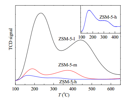 Figure 4 shows the NH3-TPD profiles of the ZSM-5 zeolites with varying SARs. The ZSM-5 zeolites displayed two prominent desorption peaks at 232 and 442 °C, which were assigned to weak acid sites and strong acid sites, respectively [15]. An increase in SAR resulted in a marked decrease in the density of both acid sites, consistent with the Py-IR analysis of the zeolites.