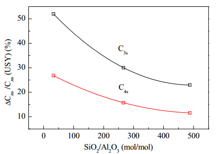 To further understand the effect of SAR of the ZSM-5 zeolites on the selectivity of the hybrid catalysts, the SAR dependency of ∆Cns/Cns(USY) (n = 3, 4) of the hybrid catalysts is shown in Fig. 5. The high ∆C3s/C3s(USY) values suggested that ZSM-5 zeolite had a higher C3s selectivity relative to C4s, and the highest ∆C3s/C3s(USY) value of 50% was attained over the hybrid catalyst USY/Z-l. The ∆Cns/Cns(USY) values decreased with increasing SARs. The cracking of gasoline occurring in the pores of ZSM-5 zeolite was acid-catalyzed, accordingly, the decline in ∆Cns/Cns(USY) was mainly due to a decrease in the acid density of the ZSM-5 zeolites. The sharper decline in ∆C3s/C3s(USY) with increasing SARs, relative to ∆C4s/C4s(USY), may result from a decrease in the extent of cracking of C6 olefins that is believed to have a higher C3s selectivity over C4s, and declines more drastically when compared with gasoline olefins with higher carbon numbers [16, 17, 18]. Additionally, other factors, such as the difference in the morphology of ZSM-5 crystals, may contribute to the change in ∆Cns/Cns(USY) because the morphology of ZSM-5 crystals has been reported to influence product selectivity [19, 20].