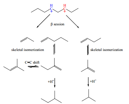 Previously, Madon proposed that ZSM-5 zeolites could catalyze both normal and branched olefin cracking to give propylene, butenes, 2-methyl 1-butene, and 2-methyl 2-butene [21]. In the present work, the following interesting phenomenon was noted: besides these light olefins, the yields of isobutane and isopentane increased markedly in the presence of ZSM-5 zeolite catalysts. The highest yields of isobutane and isopentane were obtained in the presence of hybrid catalyst USY/Z-l as shown in Table 3 and Fig. 6. According to the related literature reports [16, 17, 18], the cracking of normal octene over Brönsted acid sites mainly involves the intermediate formation of carbenium C8+. As shown in Scheme 1, carbenium C8+ can undergo β-scission (cleavage of C-C bond at the β-position to the positively charged atom) to form smaller olefins and a smaller carbenium (not shown in Scheme 1), or react with other paraffin molecules via intermolecular hydrogen transfer. The smaller carbenium may further release a hydrogen cation to form another olefin, or react with paraffin in close proximity. Because of the narrow pore and low acid density of ZSM-5 zeolites, the carbenium C8+ reacts to predominantly form smaller olefins, including propylene, butenes, and pentylenes. As the shift of the double bond in the olefins occurs easily at elevated temperatures, large amounts of isobutene and isopentene are obtained during the cracking reactions. When these olefins are subsequently adsorbed onto the USY-based catalyst with a high density of acid sites, they are saturated by hydrogen atoms through intermolecular hydrogen transfer to form isobutane and isopentane.