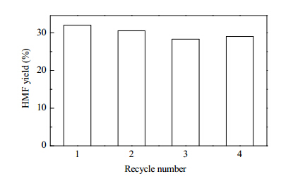Recyclability is important in catalytic applications. Figure 10 shows the recyclability of [Sn,Al]-Beta. The catalyst was evaluated in three repeated reactions; the activity dropped from 32% to 28%. After calcination,the activity increased to 29%,which was similar to that of the fresh catalyst. These results suggest that [Sn,Al]-Beta has excellent stability in glucose conversion to 5-HMF.