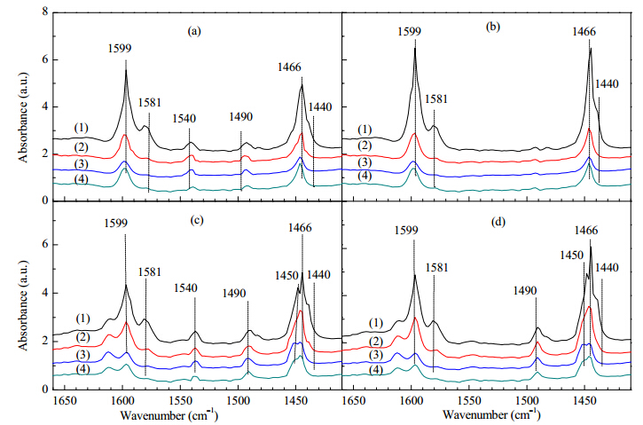 The catalytic properties of Sn-zeolites are closely related to their Lewis acidities. Pyridine was used as a probe molecule to provide detailed information on the amounts and strengths of Lewis acid sites in [Sn,Al]-Beta. The IR spectra of adsorbed pyridine in the range of pyridine-ring-stretching modes were recorded after desorption at various temperatures (Fig. 5). As can be seen from Fig. 5(b),De-Al-Beta(1700) showed the stretching mode vibrations of hydrogen-bonded (hb) and physically (ph) adsorbed pyridine at 1599 (hb,mode 8a),1581 (hb,ph,mode 8b),1483 (ph,mode 19a),1446 (hb,mode 19b),and 1440 (ph,mode 19b) cm−1 [30,31,32]. The bands at 1483 and 1440 cm−1,which are associated with physically adsorbed pyridine,disappeared after desorption at 523 K. The bands at 1599 and 1446 cm−1,which are associated with hydrogen-bonded pyridine,were more resistant against evacuation,but decreased in intensity with increasing desorption temperature. In contrast,the bands at 1490 cm−1,which are characteristic of both Brönsted and Lewis acid sites,and at 1450 cm−1,corresponding to Lewis acid sites,were absent in the spectra of De-Al-Beta(1700),regardless of the desorption temperature,suggesting that De-Al-Beta(1700) was almost free of Lewis acid sites. In the spectra of [Sn,Al]-Beta(1700),which has a relatively high Sn content,we observed two distinct bands,at 1611 and 1490 cm−1,and a shoulder at 1450 cm−1,in addition to bands similar to those shown by De-Al-Beta(1700) (Fig. 5(d)). These new bands,which are absent for De-Al-Beta(1700),were evacuation temperature resistant and remained even after desorption at 723 K (Fig. 5(d)). The bands at 1611,1490,and 1450 cm−1 correlated with different vibration modes of the pyridine rings adsorbed on Sn species incorporated into the Beta -zeolite matrix [32,33,34]. A C5H5N···Sn(IV) adduct with a pyridine molecule (ligand) coordinated to the Sn(IV) ion (center) may contribute to these bands. These three bands can be taken as evidence for the presence of Lewis acid sites in [Sn,Al]-Beta(1700). However,the spectra did not have a clear band at 1540 cm−1 from the vibrations of pyridinium ions,which is commonly used as evidence for the presence of Brönsted acid sites. [Sn,Al]-Beta(1700) therefore had Lewis acidity rather than Brönsted acidity.