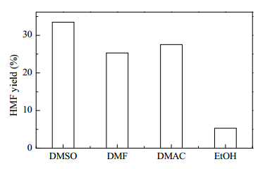 The effect of an organic solvent on the 5-HMF yield was examined using [Sn,Al]-Beta(50) as the catalyst. A number of solvents such as polar aprotic solvents,e.g.,DMF,N,N'-dimethylacetamide,DMSO,and a polar protic solvent (ethanol) were tested. Figure 7 shows that the highest 5-HMF yield (32%) was achieved using DMSO at 433 K for 4 h. Previous studies showed that DMSO plays a positive role in the uncatalyzed dehydration of carbohydrates; it protects (1) fructose from reactions other than dehydration to 5-HMF and (2) 5-HMF from rehydration and humin-forming reactions [15,35,36]. Our results were consistent with those previously reported.