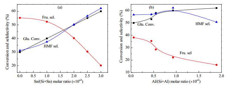 Figure 8 shows the influence of the amount of [Sn,Al]-Beta(50) on the yield of 5-HMF. When the amount of catalyst was greater than 50 mg,the yield of 5-HMF was constant. We also investigated the effect of the amounts of Sn and Al on the glucose conversion and 5-HMF/fructose selectivities. The results shown in Fig. 9(a) were obtained using the same amounts of Al. The reaction results are arranged in order of increasing Sn content,taking into account the fact that the two series of [Sn,Al]-Beta catalysts have different Sn contents. After reaction for 4 h,even the H-Al-Beta catalyst,which contained no Sn,gave a glucose conversion of 30%. As the Sn content of [Sn,Al]-Beta increased,the glucose conversion increased,and reached nearly 60% when the Si/Sn molar ratio was 35. The 5-HMF selectivity also increased,and reached nearly 62% at Si/Sn molar ratio = 35,whereas the fructose selectivity gradually decreased. However,all the increases or decreases were similar. The effects of the Al content,in the same range as that for the tests with Sn,are shown in Fig. 9(b). The glucose conversion increased gradually with increasing Al content,and the fructose selectivity decreased gradually. The 5-HMF selectivity first increased and then decreased with increasing Al content. When the Si/Al molar ratio of the parent Beta was 100,we achieved the highest 5-HMF selectivity,62%. In the light of all the above data,it can be concluded that Sn ions are important for all the reactions,especially for the first aldose-ketose isomerization process,and relatively low amounts of Al catalyze the second dehydration process.