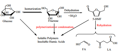 5-Hydroxymethylfurfural (5-HMF),which contains a hydroxymethyl group and an aldehyde group,has potential applications in the syntheses of many useful compounds and novel polymer materials,including medicines,plastic resins,and diesel fuel additives [9],through hydrogenation,oxydehydrogenation,esterification,halogenation,polymerization,hydrolysis,and other chemical reactions. Biomass hydrolysis is the main method for synthesizing 5-HMF,because it is a widely available raw material and cheap. 5-HMF is therefore a potential new platform compound based on biomass resources. In addition,levulinic acid (LA),another important platform compound,can be obtained by dehydration of 5-HMF,and can be used to synthesize more useful compounds and fuel additives via esterification,halogenation,oxidation,hydrogenation,and condensation.