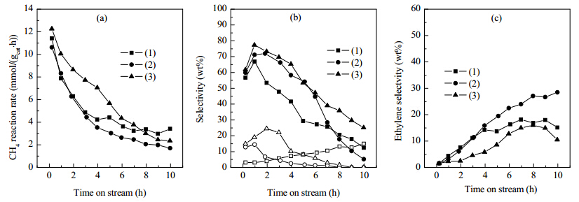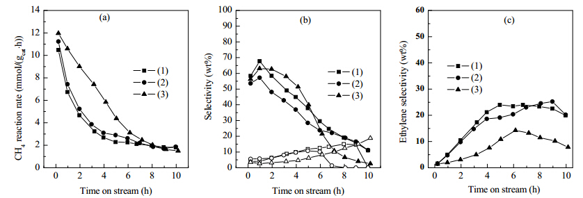 Figures 1 and 2 show the time-on-stream reaction data for Mo/HZSM-5 and Mo/HZSM-5(Si) pretreated with three different gases (CH4, He, and O2) at 973 K. In all cases, the methane conversion rate decreased with time on stream. The rates of deactivation of the two zeolite samples activated in CH4 were lower than those of the samples heated in air and He. The reaction data show that initially few hydrocarbons were present in the effluent stream; this observation is in line with previous reports [29, 38, 39, 40]. Methane carburizes the molybdenum oxide phase during the initial stages of the reaction. As low hydrocarbon selectivity is also seen for the precarburized sample, we can conclude that carburization of the molybdenum oxide precursor during catalyst activation in methane is not complete. After this initial phase, the hydrocarbon selectivity increased. The main hydrocarbon product was benzene, and naphthalene was the main aromatic side product. The highest benzene selectivity was observed after 1 h on stream; the highest benzene selectivity was 65 wt% for the Mo/HZSM-5 samples and 80 wt% for the Mo/HZSM-5(Si) samples. In line with previously reported data [21, 22, 23, 24], the maximum aromatic selectivities (benzene + naphthalene selectivity) were higher for the silylated catalysts. It can also be seen that the combined selectivities for benzene and naphthalene were close to 100% for Mo/HZSM-5(Si,CH4/He). After 1 h on stream, the benzene selectivities of the catalysts pretreated in air and He decreased rapidly. In comparison, the decrease in the benzene selectivity was less pronounced for the precarburized Mo/HZSM-5 and Mo/HZSM-5(Si) catalysts. For the precarburized catalysts, the benzene selectivities started to decrease more pronouncedly only after 4 h on stream. The total amounts of aromatics produced were the highest for the precarburized catalysts. In all cases, the decrease in aromatic selectivity was accompanied by a substantial increase i n ethylene selectivity, and a smaller increase in naphthalene selectivity. This is probably the result of deactivation of the acid sites in the micropores; this leads to higher selectivity for the intermediate product ethylene, which is formed on the molybdenum carbide phase from methane. The high naphthalene selectivity is related to the conversion of ethylene on BASs on the external surface.