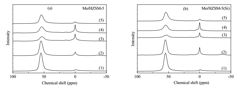 27Al MAS NMR spectroscopy was used to determine the Al speciation in the samples. The NMR spectra are shown in Fig. 4. The dominant feature, at 55 ppm, is related to framework Al (FAl). The small peak at 0 ppm is attributed to extraframework Al (EFAl). The feature at 14 ppm also arises from EFAl, in the form of Al2(MoO4)3. The increased EFAl concentration and the formation of aluminum molybdates observed for the Mo-modified ZSM-5 zeolites suggest dealumination of the framework. The FAl peaks for the Mo-modified zeolites are broader than that for the parent HZSM-5 zeolite. Tessonier et al. [42] attributed this broadening to a change in the symmetry around the Al tetrahedra following exchange of protons with molybdenum oxide species. The resonance area of the FAl peak was lower for the Mo-modified samples, probably because of asymmetric Al coordination when Mo is present at the exchange sites. On carburization, the intensity of the FAl peak decreased, which indicates further dealumination. This is probably related to the high temperatures of the carburization step. The decrease in the intensity of the FAl peak was stronger when Mo/HZSM-5 or Mo/HZSM-5(Si) was treated in He or air. This suggests a higher degree of proton exchange with molybdenum oxide species at the BASs than in activation by precarburization. A portion of the EFAl is present in the form of Al2(MoO4)3, indicated by the small peak at 14 ppm. The NMR data suggest that more FAl species are retained after precarburization than after pretreatment in He or air.