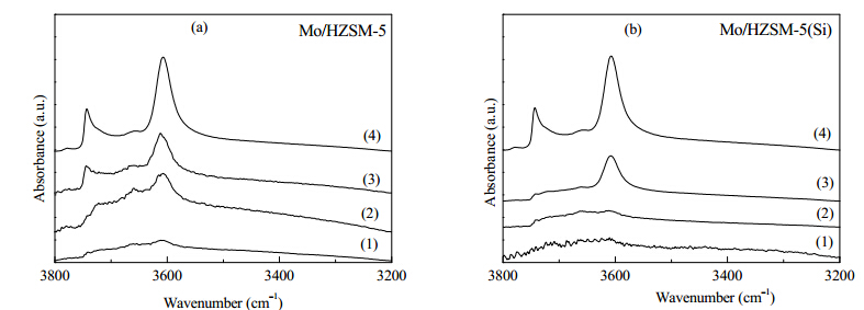 Before discussing the acidities of the most active precarburized samples in detail, we describe the Fourier-transform (FT)IR spectra of the activated samples. Because carbon formation resulted in blackening of the sample, FTIR experiments were only performed on the zeolites after activation in air or He at 973 K. The hydroxyl stretching region of the spectra contain bands at 3745, 3665, and 3610 cm−1; these are attributed to silanols, extraframework hydroxyls, and bridging hydroxyl, respectively. As expected, modification of the parent zeolite with Mo led to a decrease in the intensity of the bridging hydroxyl band. This indicates a lower BAS density as a result of proton exchange with molybdenum oxide species. The silylated Mo/HZSM-5 contained fewer acid sites. Pretreatment of the parent and silylated Mo/HZSM-5 in He or air led to the nearly complete disappearance of all hydroxyl features, including the BASs. The acid site contents of these zeolites were also investigated using pyridine adsorption measurements (Table 2). Modification of the parent zeolite with Mo followed by silylation led to a decrease in the BAS content. After activation in He or air, the BAS content decreased further. The BAS densities for these two activated zeolites are higher than those suggested by the intensity of the bridging hydroxyl band (Fig. 5). This discrepancy can be explained by the close proximity of molybdenum oxide species to the bridging hydroxyl groups, which leads to perturbation of these hydroxyls.