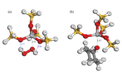 It is well known that TS-1 zeolite is an excellent catalyst to improve the nucleophilic attack capability of H2O2 in many catalytically oxidative reactions [1, 2]. When a H2O2 molecule is adsorbed on the tetrahedral Ti site (Fig. 1(a)), the charges on the Oa and Ob atoms are -0.46 and -0.48, respectively, which are more negative than those in the original H2O2 molecules (about -0.43), as given in Table 1. This indicates that the H2O2 molecules are activated, followed by formation of a Ti-OOH species.