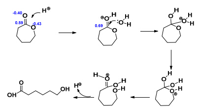 ε-carprolactone molecules are unstable. Their 7-membered rings can be opened to form 6-hydroxyhexanoic acids by hydrolysis in the presence of water [38]. Two possible O positions in ε-carprolactone can be attacked by protons, as shown in Fig. 4. The protons are contributed by H2O2 or Ti-OOH species [1, 2]. The energies required for a proton to attack the O atom in the carbonyl group and in the 7-membered ring are -1618.8 and -1618.7 kJ/mol, respectively. According to the minimum energy principle, proton ions prefer to attack the O atom in the carbonyl group of ε-carprolactone. Furthermore, the charge of the C atom in the carbonyl group increases to 0.69, which means that it can accept the nucleophilic attack of H2O molecules more easily. As a result, 6-hydroxyhexanoic acid molecules are produced by the pathway shown in Fig. 4 [1, 2, 38].