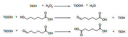 With respect to 6-hydroxyhexanoic acid molecule, there is one alcoholic hydroxyl group in its terminal position, which can be oxidized in the TS-1/H2O2/H2O system as reported in the literature [39]. Thus, it is likely that 6-hydroxyhexanoic acid is oxidized to produce adipic acid by the route illustrated in Fig. 5. As previously mentioned, H2O2 molecules can react with Ti-OH groups, forming highly oxidative Ti-OOH species. Meanwhile, 6-hydroxyhexanoic acid can be oxidized by the Ti-OOH species to produce 6-aldehyde caproic acid. Since 6-aldehyde caproic acid is very active in this condition, it is simultaneously transformed to adipic acid by oxidation with the participation of Ti-OOH species [56, 57, 58]. The detailed reaction mechanism of this reaction will be investigated in the future.