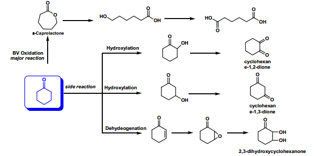 Aqueous H2O2 solution (usually 30 wt%-50 wt%), which is environmentally-friendly, cheap and easy to handle, has been introduced as the oxidant to replace hazardous peracids. One drawback is that H2O2 is less effective than peracids in attacking nucleophiles in order to activate the carbonyl group of ketones. In previous works, much effort was devoted to develop both homogeneous and heterogeneous catalysts in order to improve the performance of BV oxidation of cyclohexanone [20, 21, 22, 23, 24].