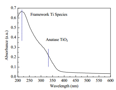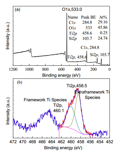 XPS provides information about the chemical composition and chemical state of titanium in the surface region (Fig. S6) [6, 7]. The Ti/Si atomic ratio estimated by XPS is 0.25/24.74 (or 1.00/98.68), which is evidently much lower than that (7.61/92.39) obtained by XRF analysis. This indicates that Ti is preferably distributed within the bulk than on the surface of the HTS-1 sample. The two peaks at 460.1 and 458.5 eV (Fig. S6(b)) correspond to framework tetrahedral Ti(IV) and extra-framework octahedral Ti(IV), respectively [8]. The DR UV-vis spectrum of HTS-1 exhibits two bands at 210 and 350 nm (Fig. S7), which can be assigned to oxygen-tetrahedral Ti(IV) and oxygen-octahedral Ti(IV), respectively [9]. This also agrees to the results obtained by XPS.