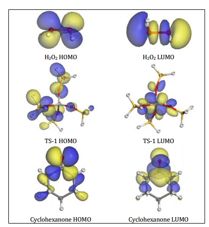 The orbital iso-surfaces of H2O2, Ti(OSiH3)OH and cyclohexanone molecules are shown in Fig. S8. There is no HOMO in the tetrahedral Ti active site, which means the Ti species can only coordinate with electron-rich functional groups by the acceptor-donator interaction between the LUMO of TS-1 and the HOMO of O atoms in the H2O2 and cyclohexanone molecules.